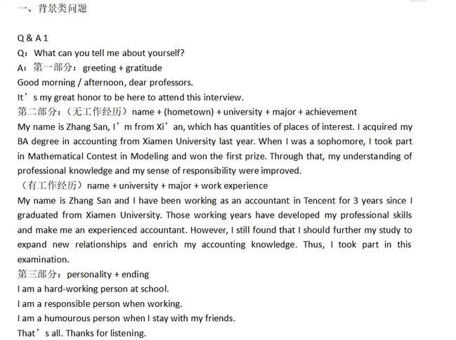 口語測試會(huì)在個(gè)人面試環(huán)節(jié)進(jìn)行,分為背景性問題,如:Could you please introduce yourself?意愿性問題,如:Why did you take the MBA examination?行為性問題,如:What contribution did you make to your current organization?專業(yè)性問題,如:What is CFO and what are the related responsibilities?