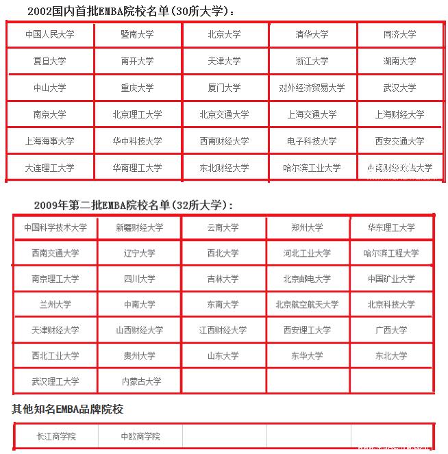 每年我國EMBA招生院校都在陸續(xù)增加,此處以第一批,第二批全國開始招生的統(tǒng)計名單為例: