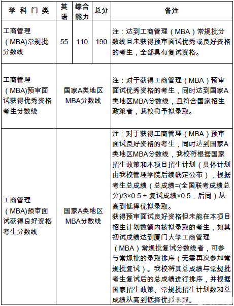 廈門大學2019年入學MBA研究生復試分數(shù)線,經(jīng)學校招生工作領導小組會議研究決定,劃分如下: