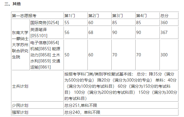 2. 統(tǒng)考考生(不含報(bào)考東南大學(xué)-蒙納士大學(xué)蘇州聯(lián)合研究生院考生和管理類聯(lián)考考生)總分超過報(bào)考院(系)專業(yè)/方向復(fù)試線20分以上(含20分)者,單科(限一門)可降2分。