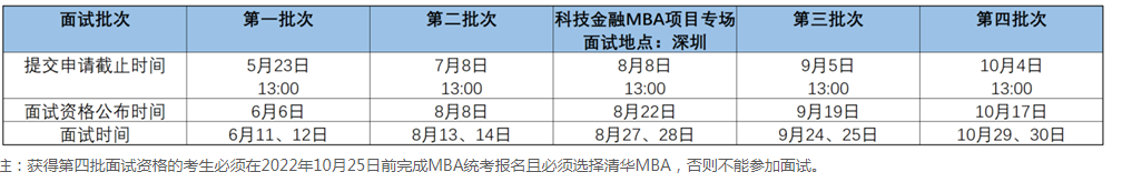 ②填寫和上傳申請(qǐng)材料。網(wǎng)上提交的申請(qǐng)材料包括:申請(qǐng)書、成績(jī)單、個(gè)人簡(jiǎn)歷、收入證明、單位組織結(jié)構(gòu)圖,推薦信(0-3封)。申請(qǐng)材料的具體內(nèi)容和要求見系統(tǒng)內(nèi)說明。考生提交申請(qǐng)材料時(shí)需要選擇申請(qǐng)面試批次,并在所選批次申請(qǐng)材料提交截止日期前提交。其中科技金融MBA項(xiàng)目專場(chǎng)僅面向申請(qǐng)清華科技金融MBA項(xiàng)目的考生,且面試地點(diǎn)在深圳。各批次的申請(qǐng)截止時(shí)間、面試資格公布時(shí)間和面試時(shí)間見下方”面試批次”表。
