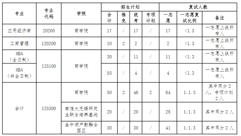 根據(jù)教育部關(guān)于研究生錄取工作中要堅持“按需招生、德智體全面衡量、擇優(yōu)錄取、寧缺毋濫”的原則及相關(guān)規(guī)定,為保證我院碩士研究生招生工作的順利進行,提高招生工作效率和保證生源質(zhì)量,既維護考生權(quán)益,又保證公平、公正、公開,根據(jù)南京信息工程大學(xué)2022年招收攻讀碩士學(xué)位研究生復(fù)試及錄取工作相關(guān)文件,結(jié)合我院實際情況,經(jīng)我院研究生復(fù)試工作領(lǐng)導(dǎo)小組討論,特制定020200應(yīng)用經(jīng)濟學(xué)、120200工商管理、125100工商管理碩士(MBA)、125300會計專碩四個碩士專業(yè)復(fù)試及錄取工作細則。一、招生指標、復(fù)試比例及復(fù)試名單確定根據(jù)研究生院相關(guān)文件,實行差額復(fù)試,復(fù)試名單以研究生院公布的名單為準。各專業(yè)招生計劃及復(fù)試名額如下: