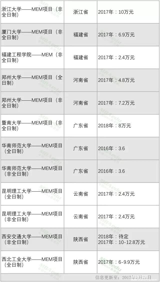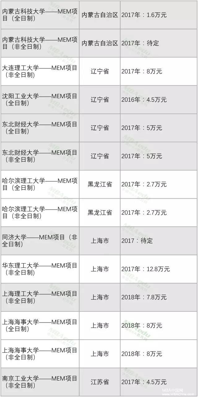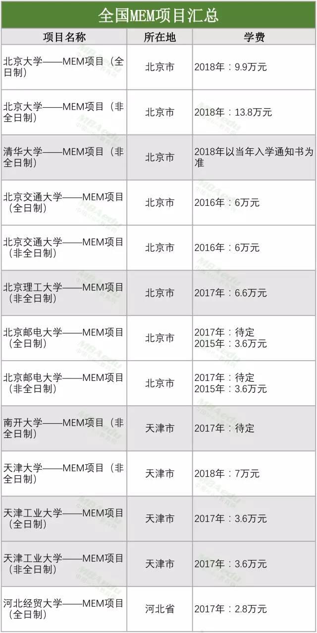 全國MEM項(xiàng)目學(xué)費(fèi)匯總MEM調(diào)劑